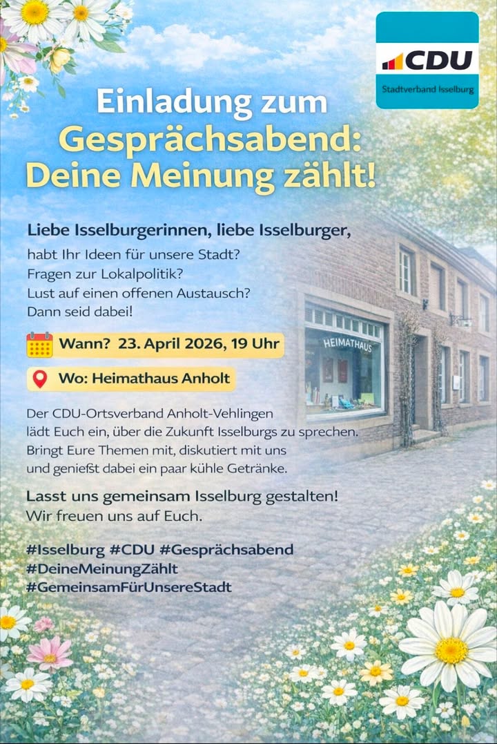 Deine Stadt. Deine Ideen. Deine Meinung! 💡?Am 23. April laden wir euch herzlich ins Heimathaus Anholt ein. Wir wollen nicht über euch reden, sondern mit euch! 🗣️?Komm auf ein Getränk vorbei, bring deine Themen mit und lass uns Isselburg zusammen nach vorne bringen. Wir freuen uns auf einen offenen Austausch! 🙌?📍 Heimathaus Anholt🕖 23.04.2026 | 19:00 Uhr?#IsselburgAktuell #Engagement #Mitmachen #Anholt #Heimathaus #CDU